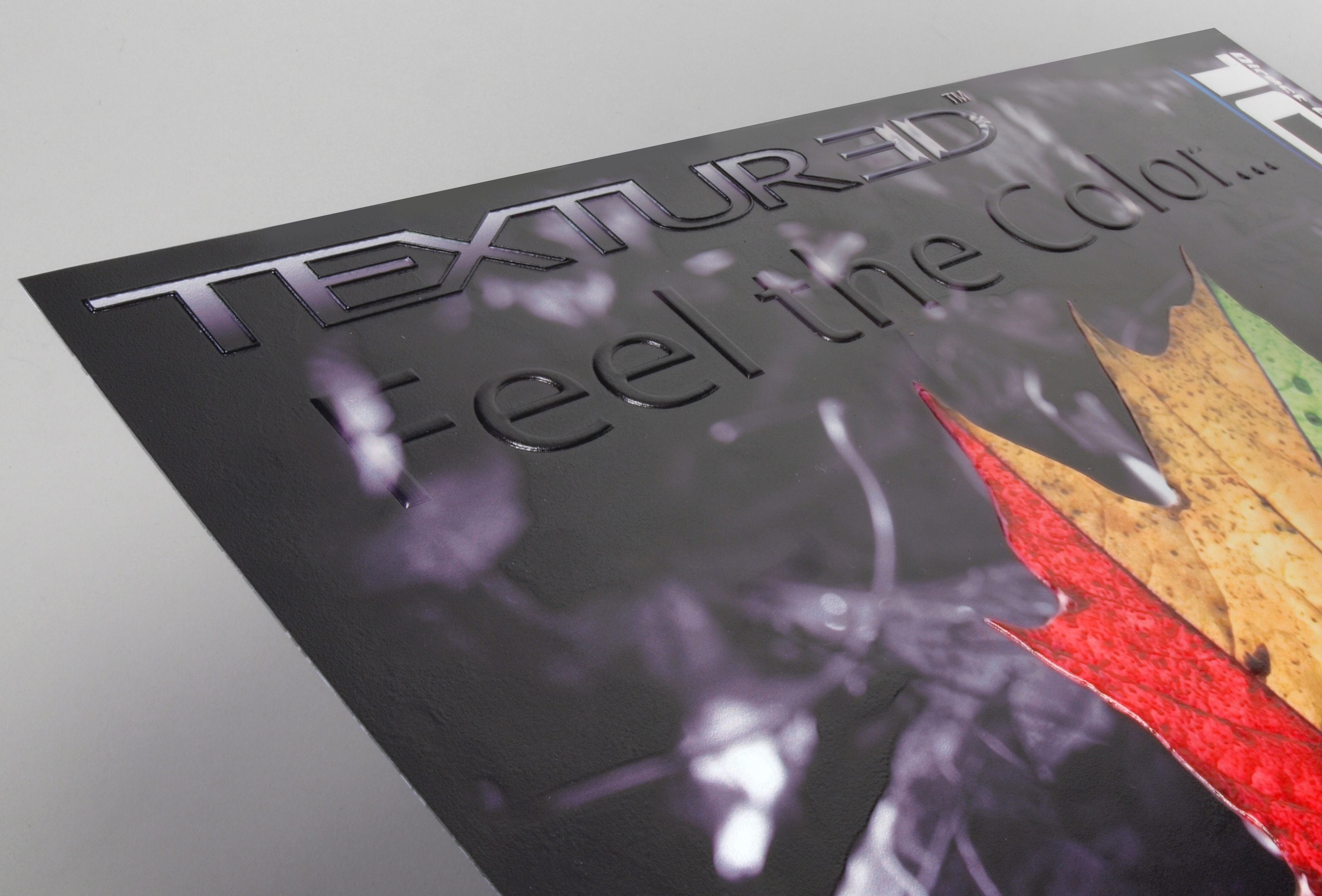 Teksto ir grafikos elementai tampa reljefiški, suteikiantys fizinį pojūtį ir prabangos įspūdį,